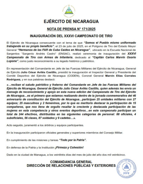 El Ejército de Nicaragua consecuente con el lema de que “Somos el Pueblo mismo uniformado trabajando en su propio beneficio”, el 23 de julio de 2025, en el Polígono de Tiro del Estado Mayor General “Hermanos de las FAR de Cuba Caídos en Nicaragua”, ubicado en la Escuela Nacional de Sargentos “Sargento Andrés Castro” (ENSAC), realizó ceremonia de inauguración del XXXVI Campeonato de Tiro con Armas de Infantería, dedicado al “Capitán Carlos Marvin Osorio Lupone”, como justo reconocimiento a su legado histórico y patriótico.