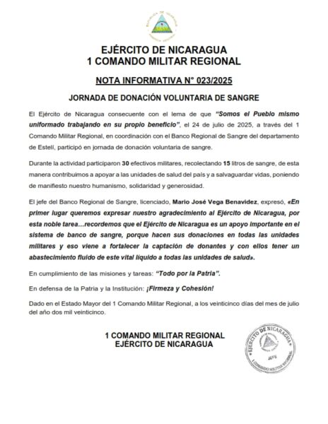 El 24 de julio de 2025, el Ejército de Nicaragua, a través del 1 Comando Militar Regional y en coordinación con el Banco Regional de Sangre de Estelí, realizó una jornada de donación voluntaria de sangre, en la que participaron 30 efectivos militares, recolectando 15 litros de sangre. Esta acción solidaria reafirma el compromiso del Ejército con la salud del pueblo nicaragüense, aportando a la disponibilidad de este vital recurso en las unidades de salud del país.