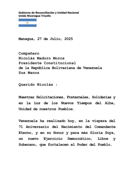Remitimos Saludo, en las Glorias del Alba de Nuestros Pueblos, al Presidente Constitucional de la República Bolivariana de Venezuela, Compañero Nicolás Maduro Moros, y a toda esa Gran Familia Bolivariana.