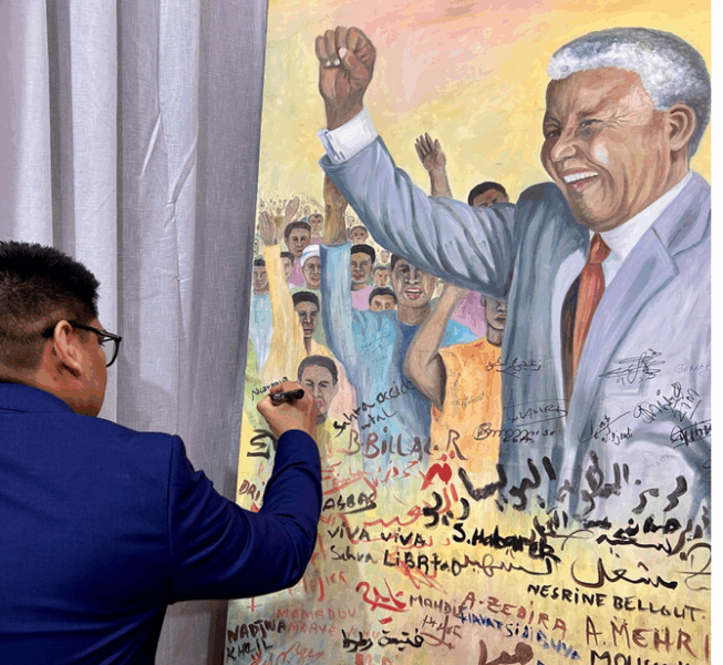 El Conferencista Señor Noureddine Djoudi resaltó como la Revolución Argelina inspiró a movimientos de liberación en África, incluyendo la lucha contra el apartheid en Sudáfrica liderada por Nelson Mandela quien admiraba la resistencia argelina y recibió apoyo del Frente de Liberación Nacional durante su lucha.
