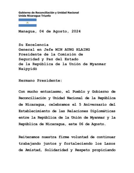 El Comandante Daniel Ortega y la Compañera Rosario Murillo enviaron un mensaje de saludo y felicitación al General en Jefe Min Aung Hlaing, Presidente de la Comisión de Seguridad y Paz del Estado de Myanmar, con motivo del quinto aniversario del establecimiento de relaciones diplomáticas entre Nicaragua y la República de la Unión de Myanmar. En su misiva, destacaron la voluntad de fortalecer los lazos de cooperación y amistad entre ambos países.