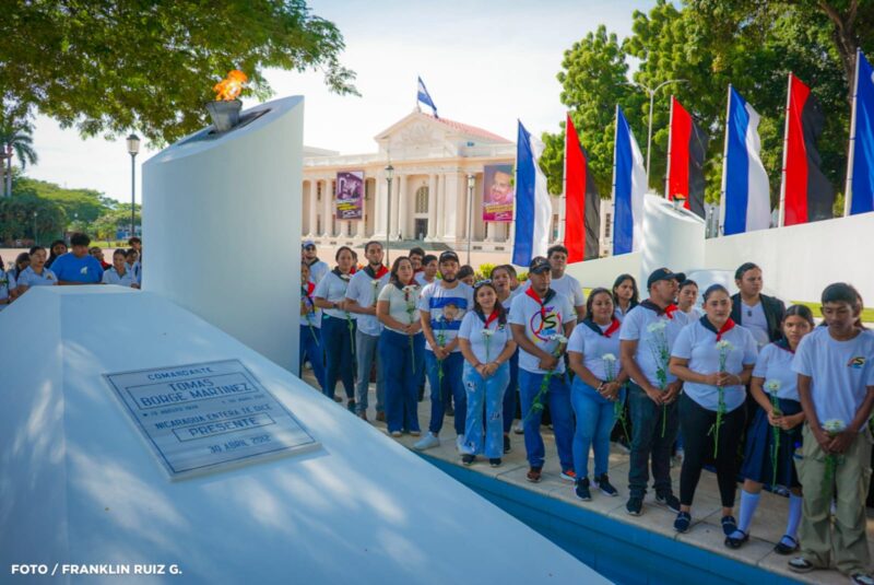 Pineda recordó que Tomás Borge, con sus escritos, su poesía y su ejemplo de firmeza ideológica, sigue siendo una guía para las nuevas generaciones. “Hoy, la juventud heroica y valiente rinde homenaje a un hombre que jamás traicionó sus principios, que caminó junto al pueblo y cuya frase resuena con fuerza: ‘Habrá Frente Sandinista hoy, mañana y siempre”.