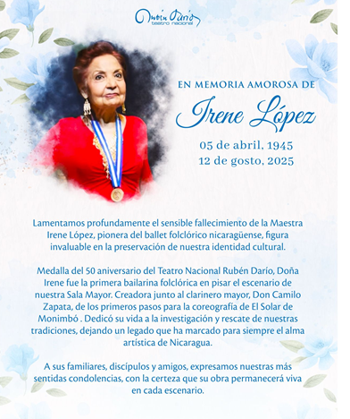 El Teatro Nacional Rubén Darío lamenta profundamente el fallecimiento de la Maestra Irene López, primera bailarina folclórica en pisar nuestra Sala Mayor y orgullosa portadora de la Medalla del 50 Aniversario. Su legado en la danza, la investigación cultural y la puesta en escena de obras como El Solar de Monimbó y El Gran Pícaro marcaron un antes y un después en el arte nicaragüense. Su huella perdurará por siempre en nuestra memoria.