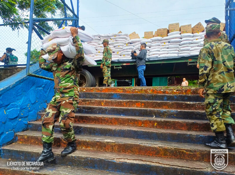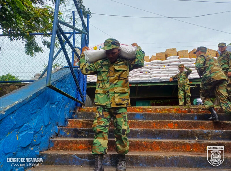 El Ejército de Nicaragua consecuente con el lema de que “Somos el Pueblo mismo uniformado trabajando en su propio beneficio”, el 14 de agosto de 2025, a través del Destacamento Militar Sur, en coordinación con el Ministerio de Educación (MINED), participó en el descargue de 239 paquetes alimenticios (arroz, frijoles, maíz, cereal y aceite), en la bodega de la escuela primaria “Juanita Vigil Sandino” del municipio de San Carlos, departamento de Río San Juan.