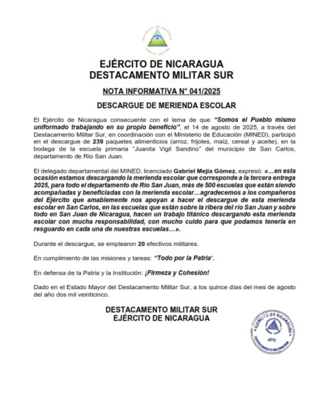 El 14 de agosto de 2025, el Destacamento Militar Sur del Ejército de Nicaragua, en coordinación con el Ministerio de Educación, participó en el descargue de 239 paquetes de merienda escolar en la bodega de la escuela primaria “Juanita Vigil Sandino” de San Carlos, beneficiando a más de 500 escuelas del departamento de Río San Juan. El delegado departamental del MINED, Gabriel Mejía Gómez, destacó la labor de los efectivos militares en garantizar el resguardo y la entrega responsable de los alimentos a las escuelas. Durante la actividad se emplearon 20 efectivos, reafirmando el compromiso del Ejército con la educación y el bienestar del pueblo.