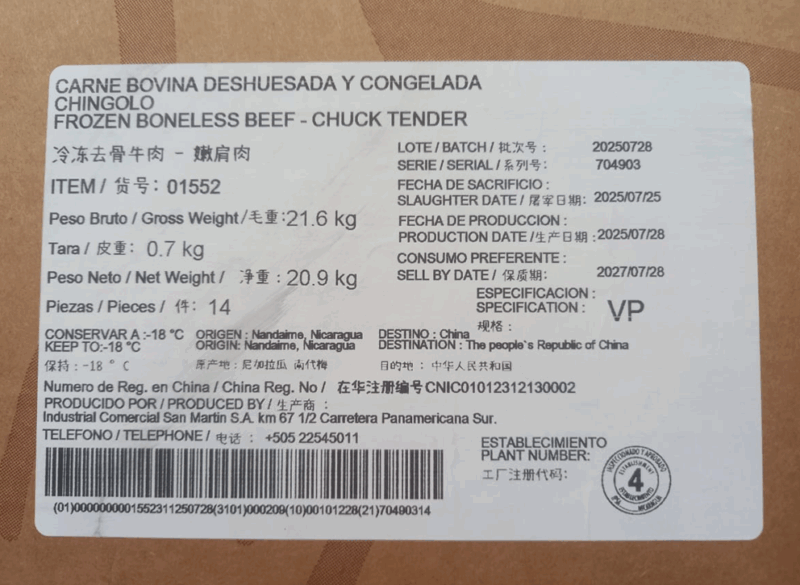 Industrial Comercial San Martín se suma así a los mataderos NICA BEEF PACKERS y NOVATERRA S.A., que ya exportan carne bovina al mercado chino, consolidando a Nicaragua como un proveedor confiable en una plaza de alta demanda y exigencia en estándares de calidad e inocuidad.