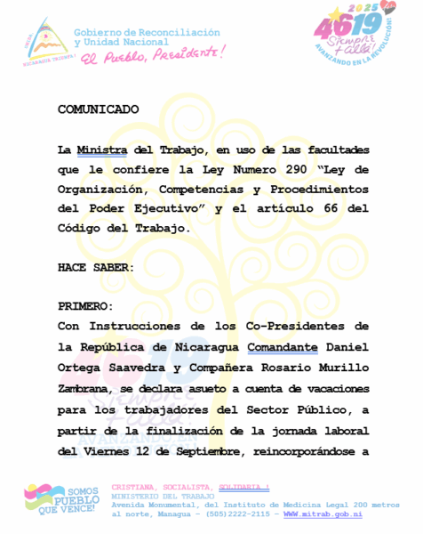 Con Instrucciones de los Co-Presidentes de la República de Nicaragua Comandante Daniel Ortega Saavedra y Compañera Rosario Murillo Zambrana, se declara asueto a cuenta de vacaciones para los trabajadores del Sector Público, a partir de la finalización de la jornada laboral del Viernes 12 de Septiembre, reincorporándose a las labores ordinarias el día Lunes 22 de Septiembre del año 2025.