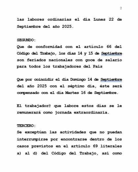 Que de conformidad con el artículo 66 del Código del Trabajo, los días 14 y 15 de Septiembre son feriados nacionales con goce de salario para todos los trabajadores del País