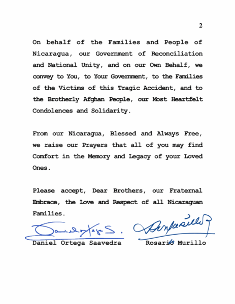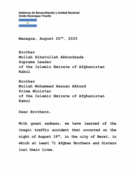 El Copresidente Comandante Daniel Ortega y la Copresidenta Compañera Rosario Murillo enviaron un mensaje de condolencias y solidaridad a los Hermanos Mullah Hibatullah Akhundzada, Líder Supremo del Emirato Islámico de Afganistán, y Mullah Mohammad Hasan Akhund, Primer Ministro, ante el lamentable accidente de tránsito ocurrido la noche de ayer en la ciudad de Herat. En su mensaje, expresaron su profundo pesar por la pérdida de vidas humanas y extendieron su acompañamiento fraterno al pueblo afgano en estos momentos de dolor.