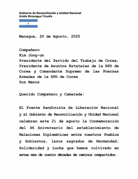 Con motivo del 46º Aniversario del establecimiento de Relaciones Diplomáticas entre nuestros Pueblos y Gobiernos, el Copresidente-Comandante Daniel Ortega y la Copresidenta Compañera Rosario Murillo enviaron un mensaje de saludo y felicitación al Compañero Kim Jong-un, destacando los lazos de amistad y cooperación que unen a Nicaragua y la República Popular Democrática de Corea.
