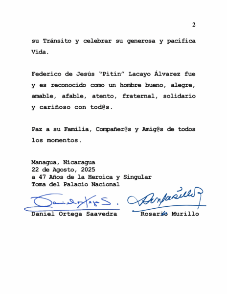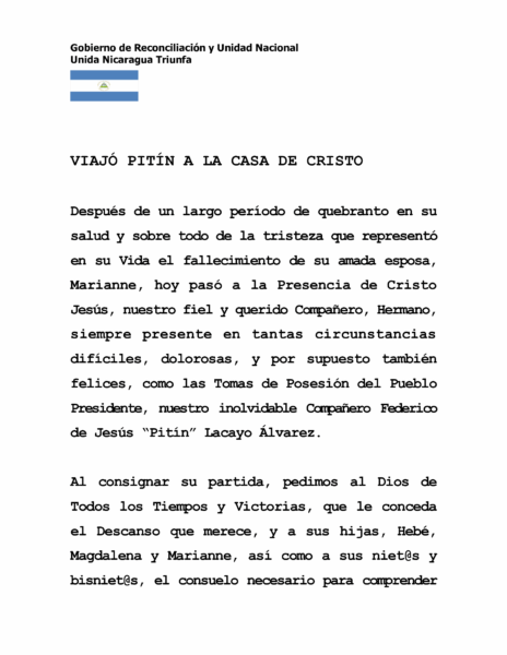 Después de un largo período de quebranto en su salud y sobre todo de la tristeza que representó en su Vida el fallecimiento de su amada esposa, Marianne, hoy pasó a la Presencia de Cristo Jesús, nuestro fiel y querido Compañero, Hermano, siempre presente en tantas circunstancias difíciles, dolorosas, y por supuesto también felices, como las Tomas de Posesión del Pueblo Presidente, nuestro inolvidable Compañero Federico de Jesús “Pitín” Lacayo Álvarez.