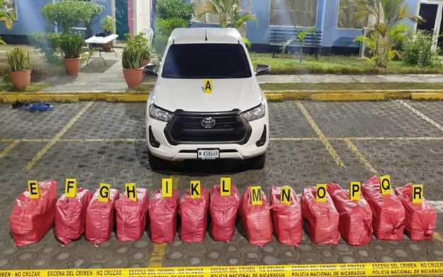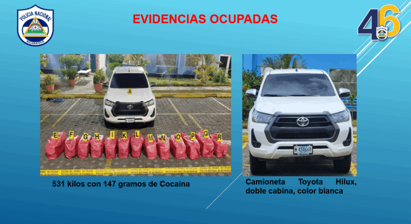 El Comisionado General Victoriano Ruiz Urbina, jefe de las fuerzas policiales, informó que, como resultado de la Estrategia del Plan Muro de Contención contra el Crimen Organizado y el tráfico de droga, la Policía Nacional incautó un fuerte cargamento de cocaína. El operativo se desarrolló el jueves 28 de agosto de 2025, a las 11:50 de la noche, en vía pública, empalme de Marbella, 100 metros al este, municipio San Rafael del Sur, Managua, donde se detuvo la camioneta Toyota Hilux, doble cabina color blanco, placa M434668, conducida por Byron Javier Marenco Narváez, de 32 años.
