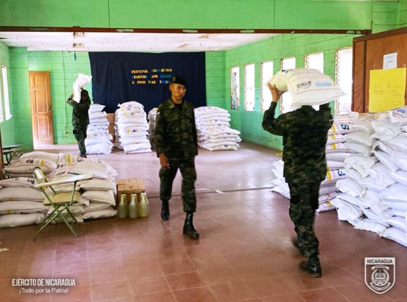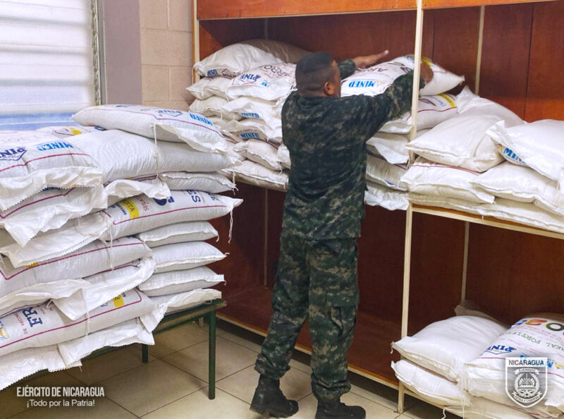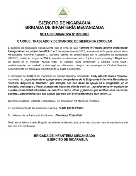 El Ejército de Nicaragua consecuente con el lema de que “Somos el Pueblo mismo uniformado trabajando en su propio beneficio”, el 1 de septiembre de 2025, a través de la Brigada de Infantería Mecanizada “General Augusto C. Sandino” (BIM), en coordinación con el Ministerio de Educación (MINED), realizó el cargue de 256.5 quintales de alimentos (arroz, frijoles, maíz, cereal) y 190 galones de aceite en el Instituto “Nueva Vida”, el Colegio “Bello Amanecer” y Colegio “Bella Cruz”, posteriormente, se trasladó y descargó en diferentes colegios del municipio de Ciudad Sandino, departamento de Managua, beneficiando a 1,623 estudiantes.