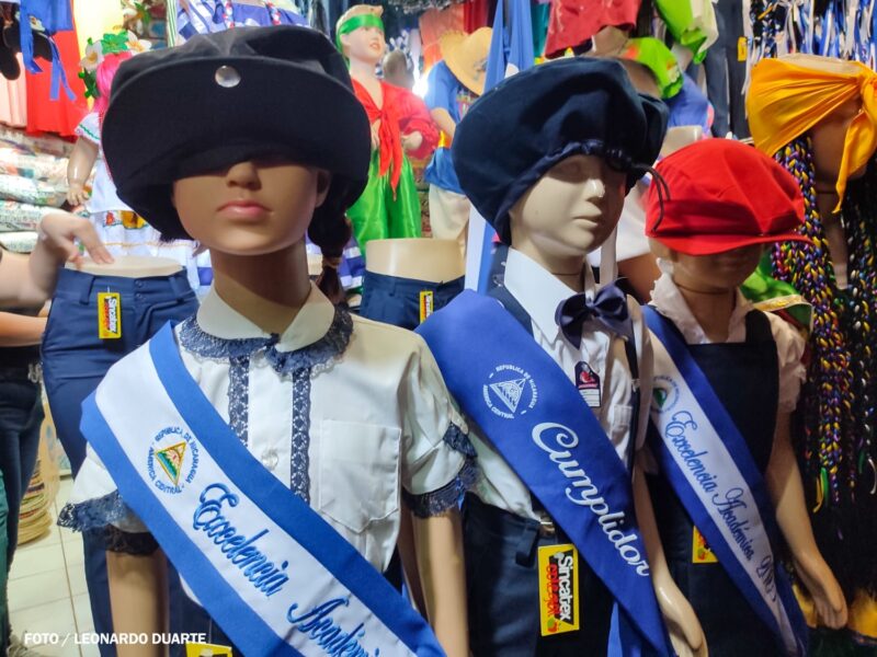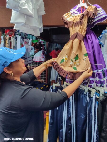 Durante la feria de septiembre, 150 comerciantes participan ofreciendo descuentos y productos alusivos a las celebraciones. Entre ellos, Eloísa Sequeira, quien invitó a los padres de familia a aprovechar los precios. “El traje de niño cuesta 450 córdobas, las faldas entre 250 y 280 según el tamaño, y también tenemos huipiles de niñas y adultos desde 400 hasta 1,400 córdobas. Además, ofrecemos banderas, collares y accesorios a precios muy bajos”, detalló.
