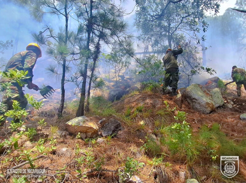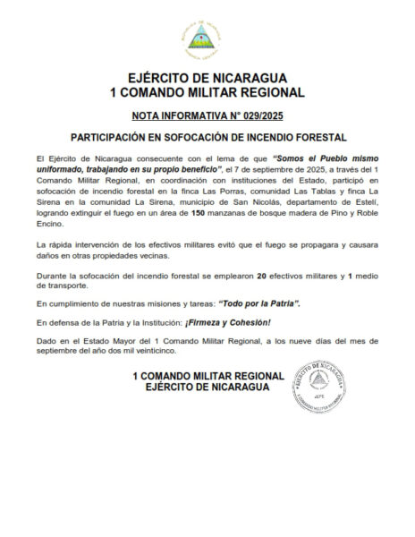 El Ejército de Nicaragua consecuente con el lema de que “Somos el Pueblo mismo uniformado, trabajando en su propio beneficio”, el 7 de septiembre de 2025, a través del 1 Comando Militar Regional, en coordinación con instituciones del Estado, participó en sofocación de incendio forestal en la finca Las Porras, comunidad Las Tablas y finca La Sirena en la comunidad La Sirena, municipio de San Nicolás, departamento de Estelí, logrando extinguir el fuego en un área de 150 manzanas de bosque madera de Pino y Roble Encino.