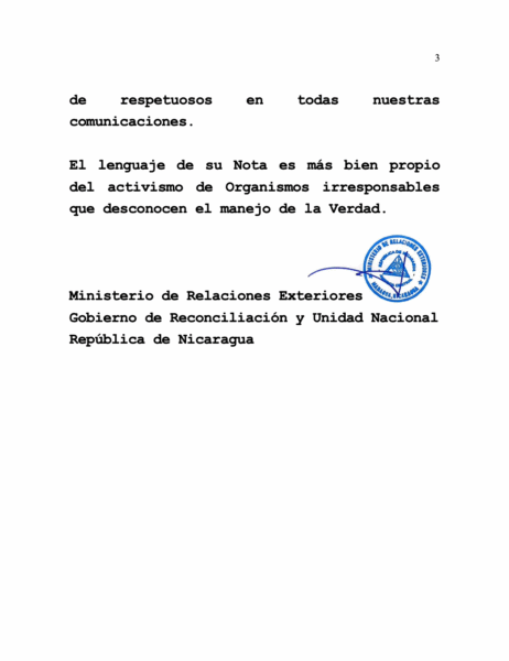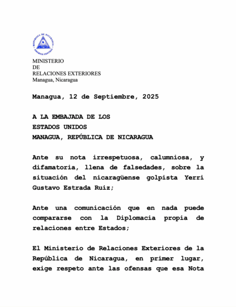 El Ministerio de Relaciones Exteriores de la República de Nicaragua rechaza de manera categórica la comunicación emitida por la Embajada de los Estados Unidos en Managua, la cual considera irrespetuosa, difamatoria y carente de fundamentos, al difundir falsedades sobre la situación del golpista nicaragüense Yerri Gustavo Estrada Ruiz.
