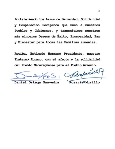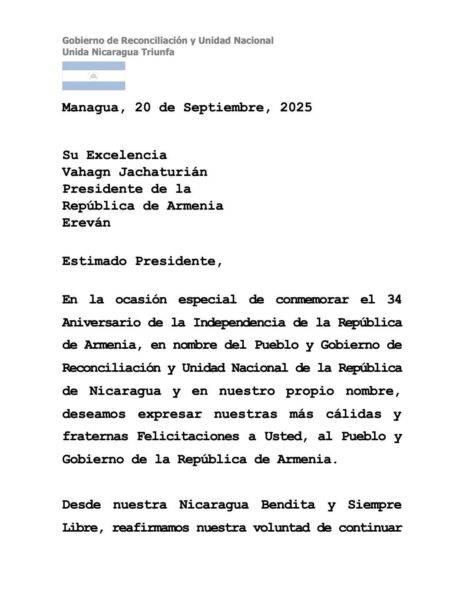 Desde nuestra Nicaragua Bendita y Siempre Libre, reafirmamos nuestra voluntad de continuar fortaleciendo los Lazos de Hermandad, Solidaridad y Cooperación Recíproca que unen a nuestros Pueblos y Gobiernos, y transmitimos nuestros más sinceros Deseos de Éxito, Prosperidad, Paz y Bienestar para todas las Familias armenias.