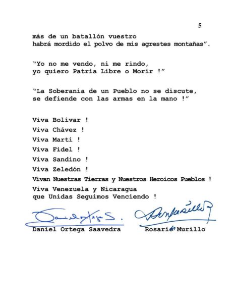En la misiva enviada por Daniel Ortega y Rosario Murillo al presidente Maduro indican que el liderazgo y valentía del líder obrero son determinantes para avanzar hacia el camino de la paz, que se defenderá como patrimonio espiritual y material superior de los pueblos.