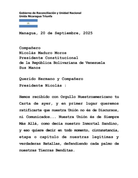 En nombre del Presidente Nicolás Maduro, Venezuela expresa su más sincero agradecimiento por las palabras de unidad, solidaridad y resistencia del Presidente Daniel Ortega y la Co-Presidenta Rosario Murillo. Su mensaje nos inspira y fortalece en nuestra lucha contra las amenazas que enfrentamos, defendiendo así la soberanía de nuestro pueblo y la paz en nuestra región caribeña. La unión de nuestros pueblos siempre será la clave para la victoria.