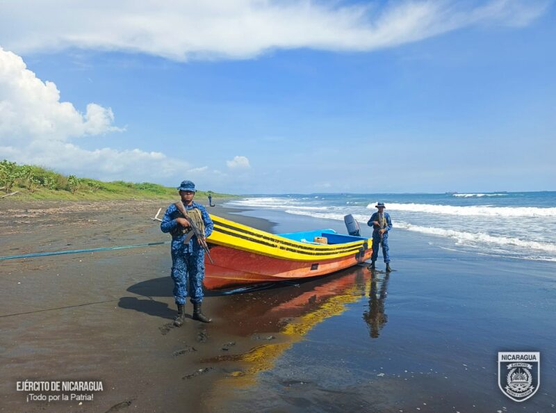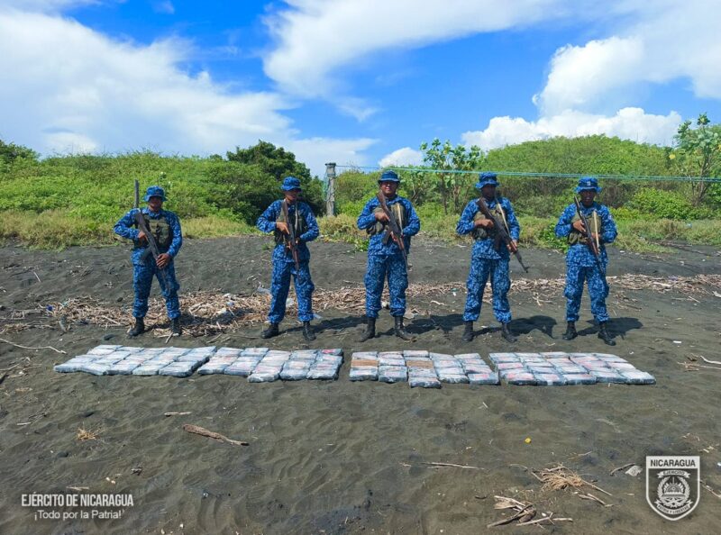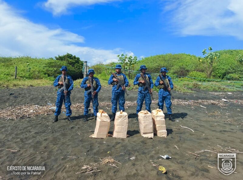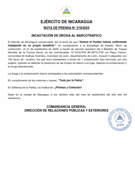 El Ejército de Nicaragua, en cumplimiento de la Estrategia de Estado “Muro de contención”, informó que el 21 de septiembre de 2025, a través del 2 Batallón de Tropas Navales de la Fuerza Naval, se incautaron 4 paquetes con 102 tacos de cocaína en Playa Tesoro, municipio de León. La droga era trasladada en una embarcación tipo bermuda, la cual fue abandonada por dos sujetos que se dieron a la fuga; posteriormente, tanto la droga como la embarcación fueron entregadas a las autoridades competentes.