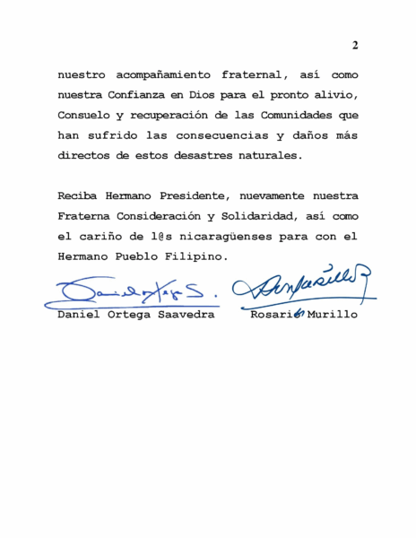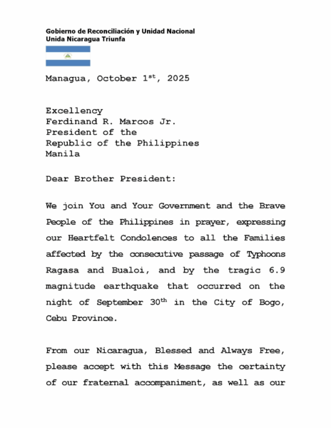 El Copresidente Comandante Daniel Ortega y la Copresidenta Compañera Rosario Murillo han expresado, en nombre del Pueblo y Gobierno de Reconciliación y Unidad Nacional de Nicaragua, sus más sinceras condolencias y profunda solidaridad a Su Excelencia, Hermano Ferdinand R. Marcos Jr., Presidente de la República de Filipinas, ante las dolorosas pérdidas humanas y materiales ocasionadas por el paso consecutivo de los tifones Ragasa y Bualoi, así como por el trágico terremoto ocurrido recientemente en ese Hermano País.