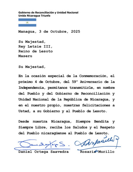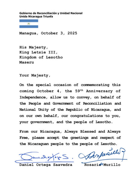 Nicaragua saluda al Reino de Lesoto en el 59° Aniversario de su Independencia