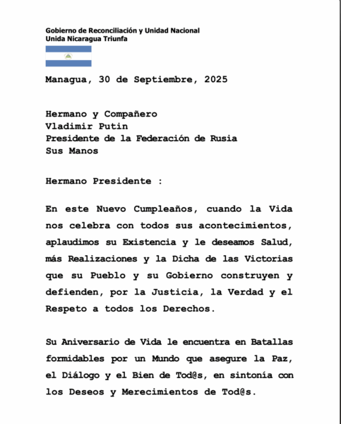 El Gobierno de Nicaragua que preside los copresidentes, Comandante Daniel Ortega y compañera Rosario Murillo enviaron mensaje al Presidente de la Federación de Rusia, Vladimir Putin en su ocasión de su cumpleaños.