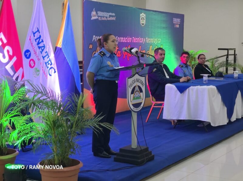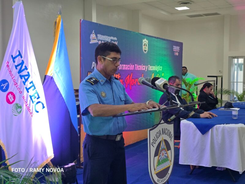Durante su intervención, el Comisionado César Alberto Leyva Bustos, rector de la Universidad de Ciencias Policiales, destacó que la clausura de esta edición representa “un esfuerzo conjunto entre el INATEC y la Policía Nacional, con el respaldo del Buen Gobierno Sandinista que dirigen el Comandante Daniel Ortega Saavedra y la Compañera Rosario Murillo”.