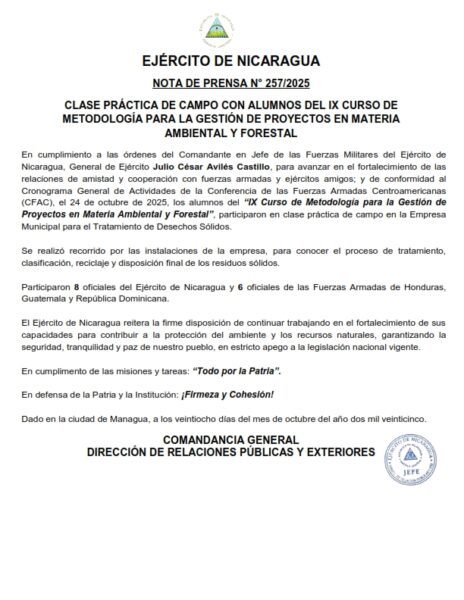 En cumplimiento a las órdenes del Comandante en Jefe de las Fuerzas Militares del Ejército de Nicaragua, General de Ejército Julio César Avilés Castillo,para avanzar en el fortalecimiento de las relaciones de amistad y cooperación con fuerzas armadas y ejércitos amigos; y de conformidad al Cronograma General de Actividades de la Conferencia de las Fuerzas Armadas Centroamericanas (CFAC), el 24 de octubre de 2025, los alumnos del “IX Curso de Metodología para la Gestión de Proyectos en Materia Ambiental y Forestal”, participaron en clase práctica de campo en la Empresa Municipal para el Tratamiento de Desechos Sólidos.