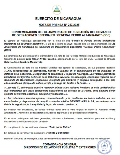 El Ejército de Nicaragua consecuente con el lema de que “Somos el Pueblo mismo uniformado trabajando en su propio beneficio”, el 28 de octubre de 2025, realizó acto en conmemoración del XL Aniversario de Fundación del Comando de Operaciones Especiales “General Pedro Altamirano” (COE).