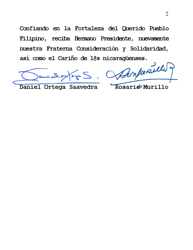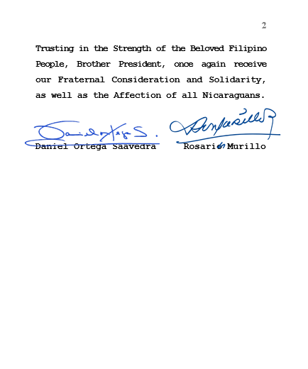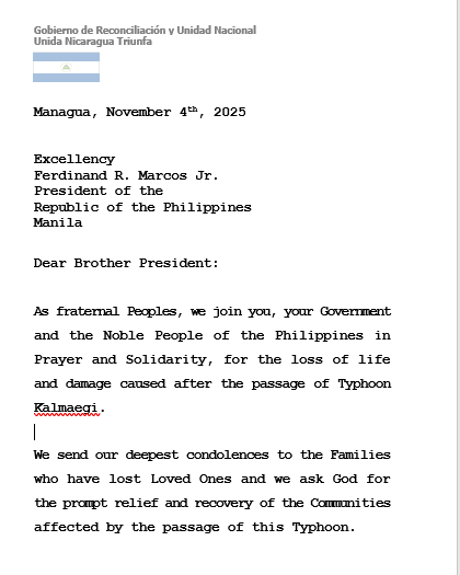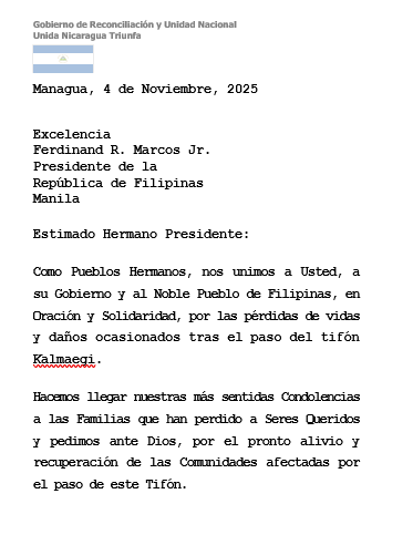 El Copresidente Daniel ortega y la Copresidenta Rosario Murillo expresan su más sentido mensaje de condolencias y solidaridad a Su Excelencia, Hermano Ferdinand R. Marcos Jr., Presidente de la República de Filipinas, ante las trágicas pérdidas de vidas y los daños ocasionados por el paso del tifón Kalmaegi, reiterando su apoyo y fraternidad en estos difíciles momentos para el pueblo filipino.