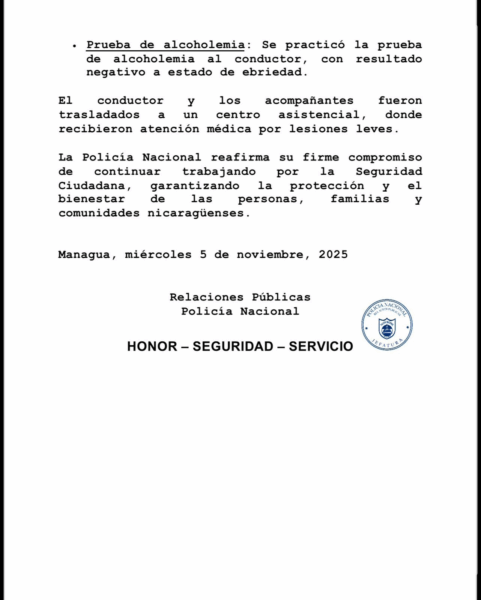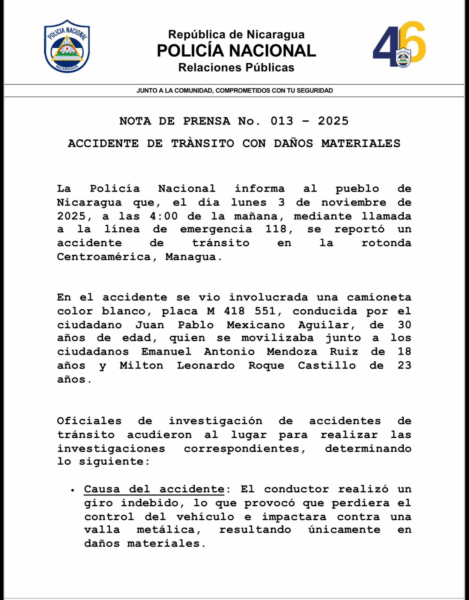 La Policía Nacional informa que el 3 de noviembre de 2025, a las 4:00 a.m., ocurrió un accidente en la rotonda Centroamérica, Managua. Una camioneta blanca, placa M 418 551, conducida por Juan Pablo Mexicano Aguilar, perdió el control por un giro indebido e impactó una valla metálica. Solo hubo daños materiales y lesiones leves; la prueba de alcoholemia resultó negativa.