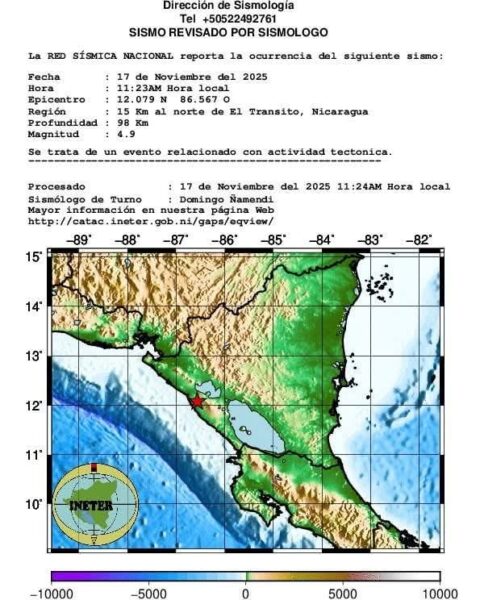 La Copresidenta de Nicaragua y Coordinadora del Consejo de Comunicación y Ciudadanía, compañera Rosario Murillo, informó este lunes 17 de noviembre sobre el sismo registrado esta mañana en el océano Pacífico, cerca de las costas nacionales, el cual gracias a Dios no dejó afectaciones.