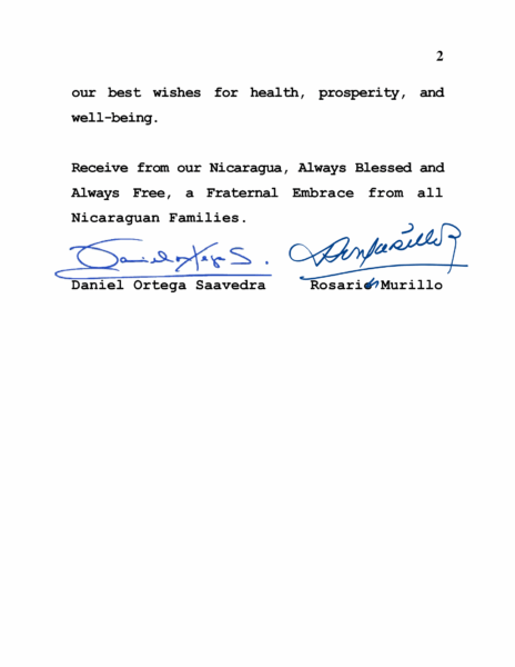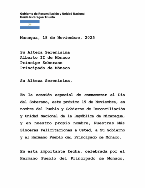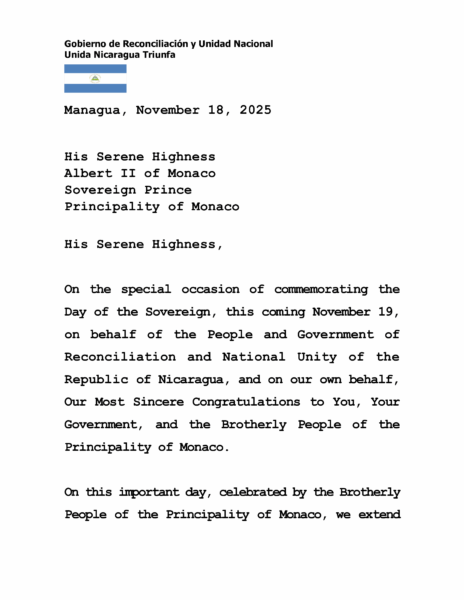 El Copresidente Daniel Ortega y la Copresidenta Rosario Murillo expresan sus más cordiales saludos y sinceras felicitaciones a Su Alteza Serenísima Alberto II, Príncipe Soberano del Principado de Mónaco, con motivo de la conmemoración del Día del Soberano, reiterando los lazos de amistad y cooperación entre ambos pueblos.