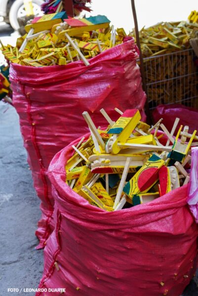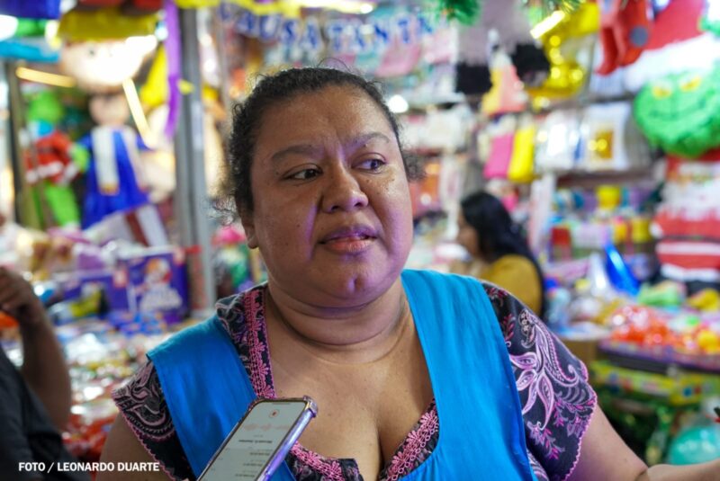 Jahaira Lovos, por su parte, destaca su oferta de panitas, vasos y panderetas, incluyendo tacitas de vidrio a 45 córdobas y libritos a 170 la docena, asegurando que los productos están listos para recibir a los compradores que llegan con el aguinaldo en mano.