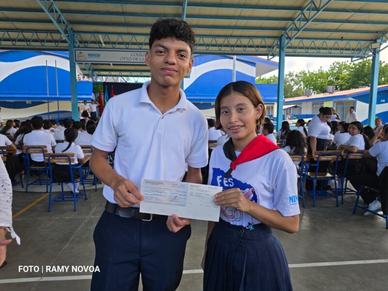 El Gobierno de Reconciliación y Unidad Nacional, a través de la Juventud Sandinista 19 de Julio, realizó la entrega del Bono Presidencial 2025 a los bachilleres del Colegio Otto de la Rocha, en el Distrito V de Managua, como parte del reconocimiento al esfuerzo académico de los jóvenes que culminan su educación secundaria.