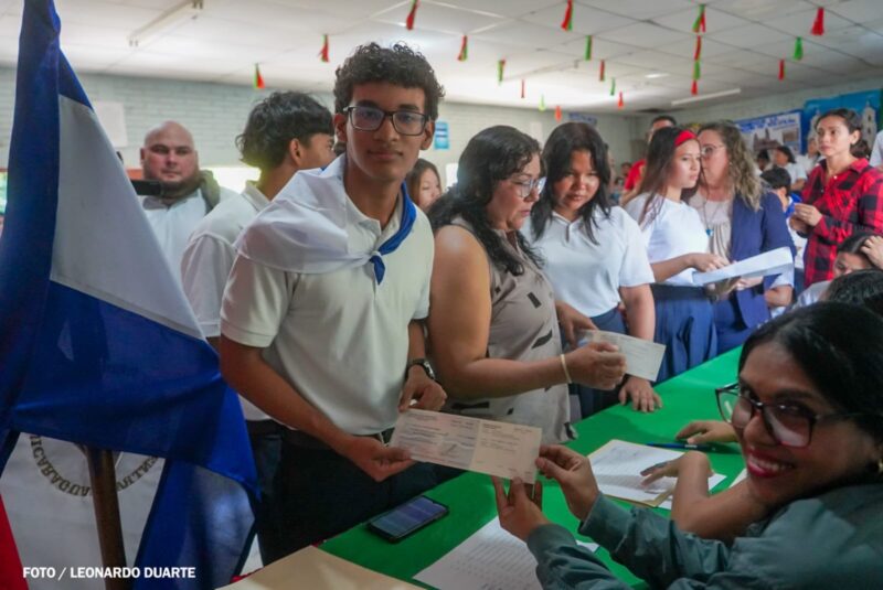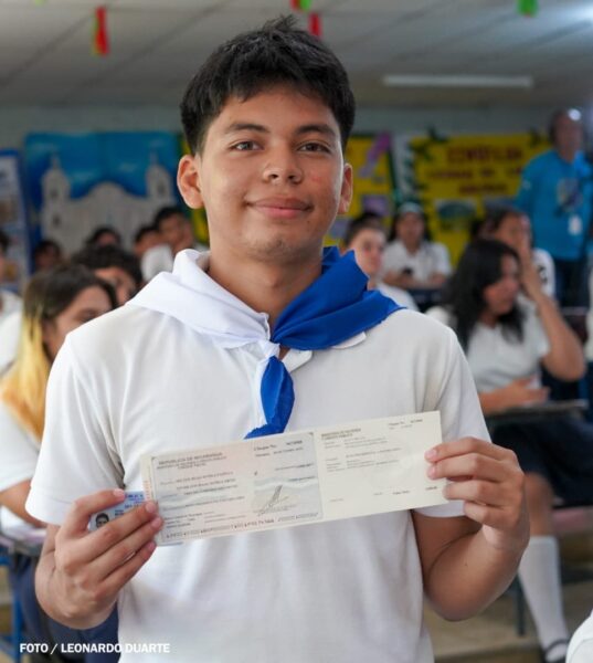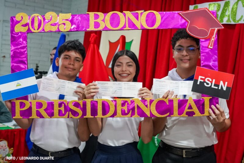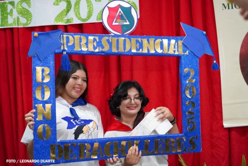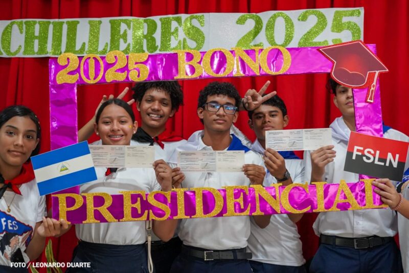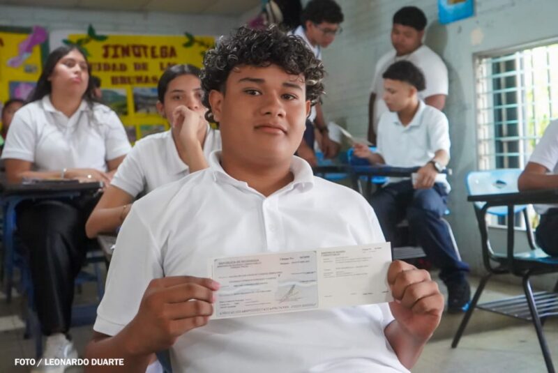 Asimismo, Edwin Gabriel Palma Matute afirmó que el bono representa un estímulo importante para continuar con sus estudios. “Estamos agradecidos con la Copresidenta Rosario Murillo y el Copresidente Daniel Ortega Saavedra, por valorar nuestra labor educativa. Este dinero lo voy a ocupar para mis estudios universitarios; ya me prematriculé en la UNAN-Managua para estudiar Odontología”, compartió.