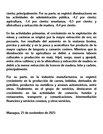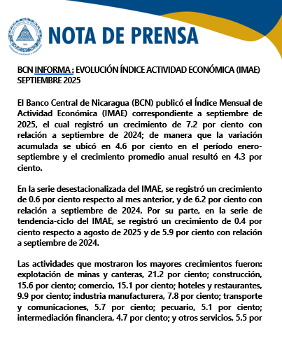 El BCN reportó que el IMAE de septiembre 2025 creció 7.2 % interanual, con una variación acumulada de 4.6 % y un promedio anual de 4.3 %, destacando incrementos en minas y canteras, construcción, comercio, hoteles y restaurantes, manufactura y transporte, mientras que cayeron agricultura, administración pública, enseñanza y silvicultura; el dinamismo provino del aumento en extracción de oro, matanza bovina, porcina y avícola, mayor captura de langosta y camarón, y mayor producción manufacturera y de servicios.