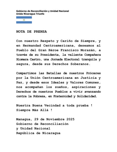 Con nuestro Respeto y Cariño de Siempre, y en Hermandad Centroamericana, deseamos al Pueblo del Gran Héroe Francisco Morazán, a través de su Presidenta, la valiente Compañera Xiomara Castro, una Jornada Electoral tranquila y segura, desde sus Derechos Soberanos.