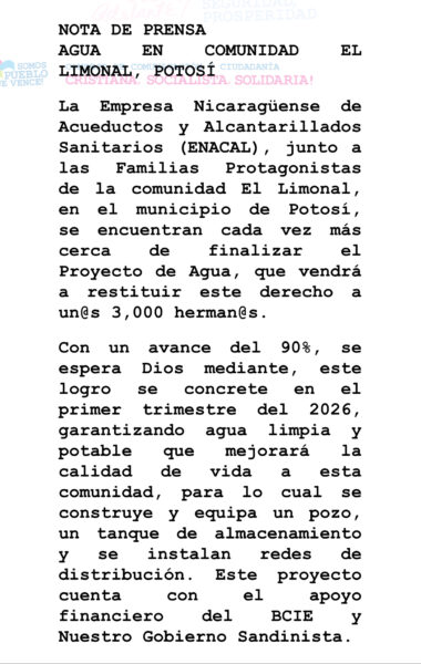 Con un avance del 90%, se espera Dios mediante, este logro se concrete en el primer trimestre del 2026, garantizando agua limpia y potable que mejorará la calidad de vida a esta comunidad, para lo cual se construye y equipa un pozo, un tanque de almacenamiento y se instalan redes de distribución. Este proyecto cuenta con el apoyo financiero del BCIE y Nuestro Gobierno Sandinista.