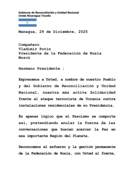 Expresamos a Usted, a nombre de nuestro Pueblo y del Gobierno de Reconciliación y Unidad Nacional, nuestra más activa Solidaridad frente al ataque terrorista de Ucrania contra instalaciones residenciales de su Presidencia.