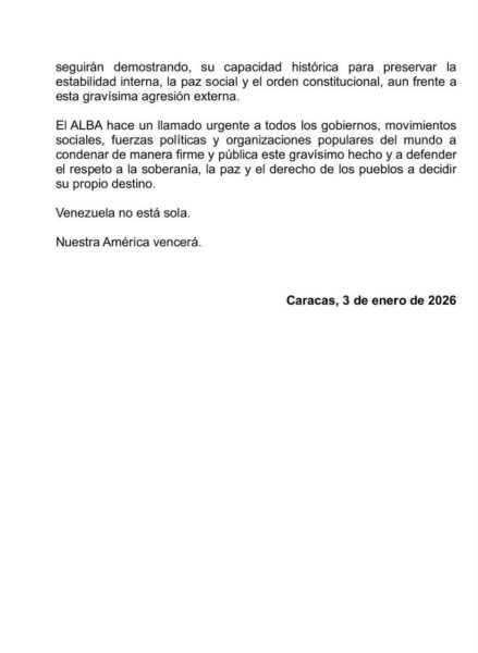 La Alianza Bolivariana para los Pueblos de Nuestra América (ALBA) condena de manera absoluta el acto de guerra perpetrado por el Gobierno de los Estados Unidos contra la República Bolivariana de Venezuela en la madrugada del 3 de enero.
