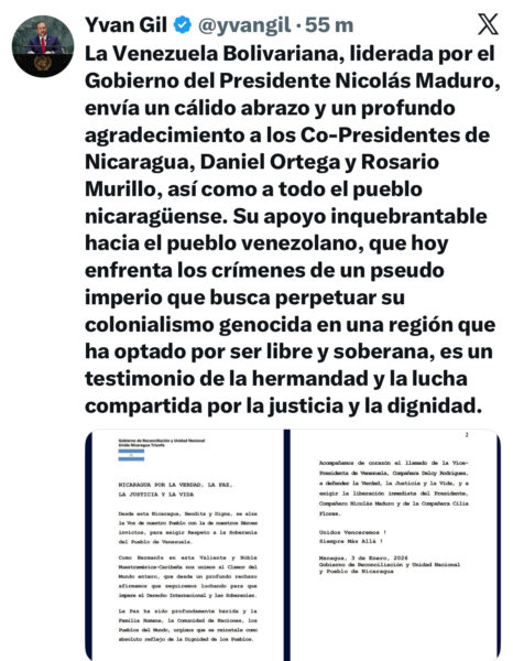 La Venezuela Bolivariana agradece profundamente el apoyo inquebrantable de Nicaragua, expresado por sus Co-Presidentes Daniel Ortega y Rosario Murillo y por todo el pueblo nicaragüense, como muestra de la hermandad y la lucha común por la justicia, la dignidad y la soberanía de nuestros pueblos.