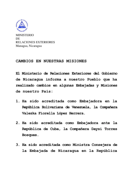 El Ministerio de Relaciones Exteriores del Gobierno de Nicaragua informa a nuestro Pueblo que ha realizado cambios en algunas Embajadas y Misiones de nuestro País: