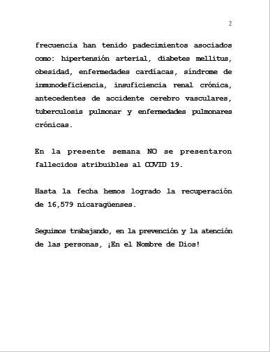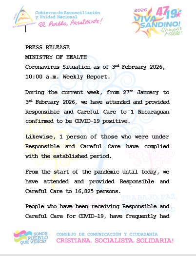 Durante la semana del 27 de enero al 03 de febrero de 2026, el Ministerio de Salud atendió a un nicaragüense con COVID-19 y una persona concluyó su período de seguimiento. No se registraron fallecidos y, hasta la fecha, se contabilizan 16,579 personas recuperadas en el país.
