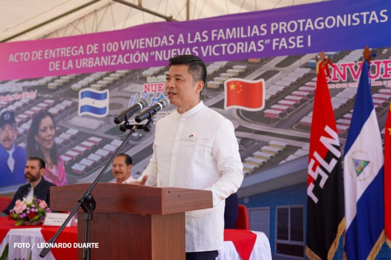 El diplomático felicitó a las familias que reciben sus viviendas y a la empresa china que ejecuta el proyecto, afirmando que para China es motivo de gran alegría acompañar a Nicaragua en iniciativas que elevan el bienestar de la población.