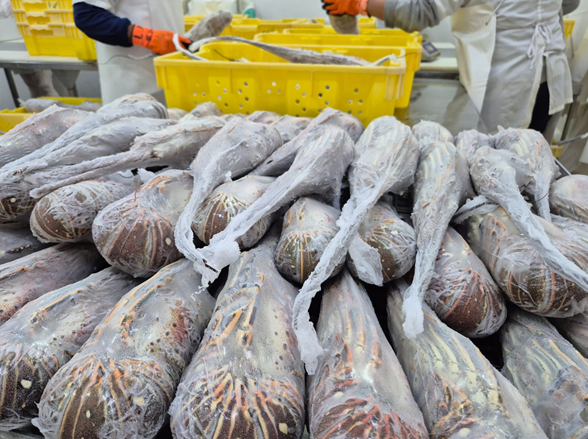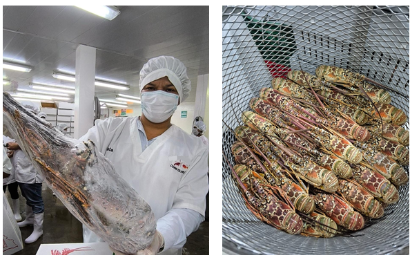 La mayoría de la producción destinada a la exportación proviene de la pesca artesanal local, que se especializa en la captura y entrega de langosta viva. Este producto es posteriormente procesado en los establecimientos, siendo la presentación de entera cruda congelada la que lidera los envíos al extranjero.