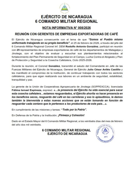 El Ejército de Nicaragua consecuente con el lema de que “Somos el Pueblo mismo uniformado trabajando en su propio beneficio”, el 25 de febrero de 2026, a través del jefe del 6 Comando Militar Regional Coronel Inf. DEM Rodolfo Antonio González, participó en reunión con 25 representantes de empresas exportadoras de café de los departamentos de Matagalpa y Jinotega, con el objetivo de evaluar y escuchar sus planteamientos relacionados al fortalecimiento del Plan Permanente de Seguridad en el Campo, Lucha Contra el Abigeato y Plan de Protección y Seguridad a la Cosecha Cafetalera, Ciclo 2025-2026.
