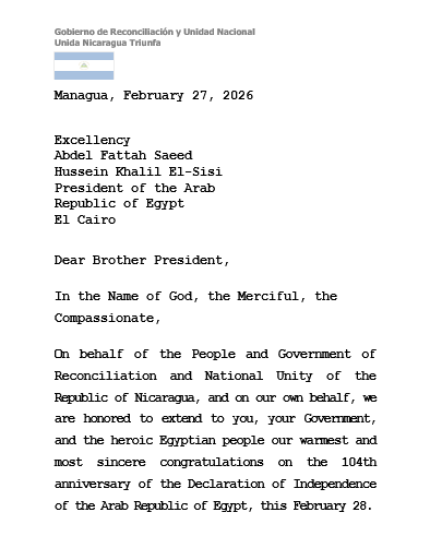 On behalf of the People and Government of Reconciliation and National Unity of the Republic of Nicaragua, and on our own behalf, we are honored to extend to you, your Government, and the heroic Egyptian people our warmest and most sincere congratulations on the 104th anniversary of the Declaration of Independence of the Arab Republic of Egypt, this February 28.