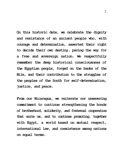 From our Nicaragua, we reiterate our unwavering commitment to continue strengthening the bonds of brotherhood, solidarity, and fraternal cooperation that unite us, and to continue promoting, together with Egypt, a world based on mutual respect, international law, and coexistence among nations on equal terms.